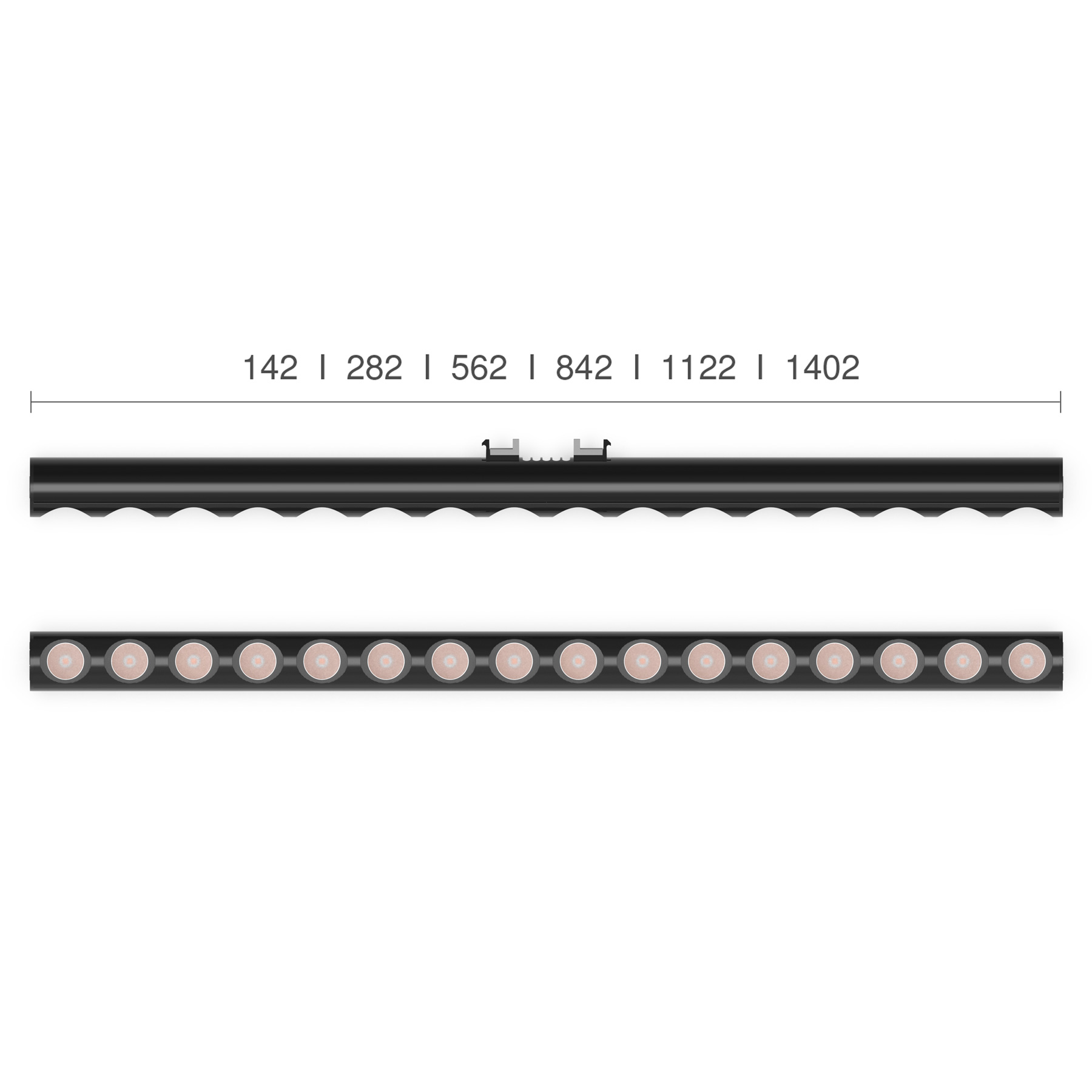 LTwo® comes in lengths of 142 mm (1/2 ft), 282 mm (1 ft), 562 mm (2 ft), 842 mm (3 ft), 1,120 mm (4 ft), and 1,400 mm (5 ft). Depending on operating current and nominal power, the output of the light source ranges from 1.8 W / 240 lumens to 35 W / 5,600 lumens. For details regarding the precise performance data, depending on the optic used, please refer to the specific datasheet.